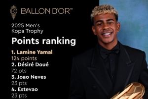体育资讯9月27日讯 金球奖官方公布了男子科帕奖的得分细节,其中亚马尔124分成功卫冕,以52分的优势领先于获得72分的杜埃,科帕奖由历届金球奖得主投票选出。《队报》报道,古利特是唯一未将第一顺位投给亚马尔的评委。
