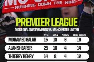 英超对阵曼联参与进球榜:萨拉赫15场19球居首,哈兰德6场11球